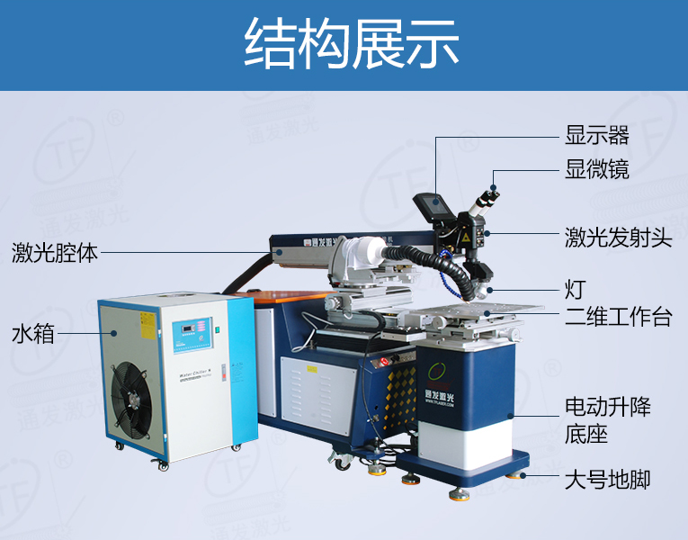 出口型模具激光焊機是通發(fā)激光公司專門為出口國外客戶使用而設計的系列機型TFL-200E,適用于各類精密注塑模具、壓鑄模具等模具激光修補焊接;同時也適合鑄件沙孔激光修補、模具崩缺激光修復、過切加工等的激光修補;各類金屬結(jié)構(gòu)件、金銀首飾的激光焊接加工。